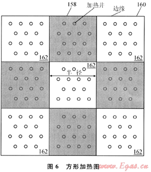 圖7為加熱井的另外一種陣列形式。在同心環(huán)形式的體積中,隨著環(huán)形體積向外移動(dòng)其周長(zhǎng)逐漸增大。所以間插加熱可減少外環(huán)體積的地層熱膨脹。