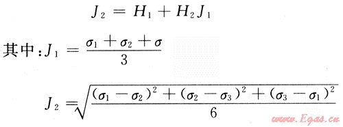 式中:J1、J2分別為應(yīng)力第一不變張量和應(yīng)力第二不變張量,MPa;H1、H2為材料參數(shù),一般通過(guò)M-C強(qiáng)度準(zhǔn)則的六棱錐擬合得到,即由M-C準(zhǔn)則中的內(nèi)聚力(c)和內(nèi)摩擦角(φ)計(jì)算得到。