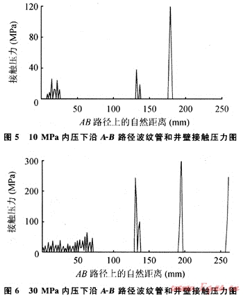 10MPa和20MPa管內(nèi)壓力下(圖5),雖然波紋管都能膨脹到和井壁接觸,并且接觸位置基本相同,但其接觸長(zhǎng)度和接觸壓力變化范圍卻很大:20MPa管內(nèi)壓力下最大接觸壓力可達(dá)200.0MPa,而10MPa管內(nèi)壓力下最大接觸壓力只有120.0MPa;特別是在30MPa的管內(nèi)壓力下(圖6),A點(diǎn)附件區(qū)域近60mm長(zhǎng)度和井壁接觸,平均接觸壓力在30MPa左右。