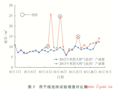 整理子洲氣田天然氣處理廠2012和2013年1—10月西干線產(chǎn)液數(shù)據(jù)進(jìn)行對(duì)比分析(圖3),泡排措施之前下游天然氣處理廠液量變化較小,增液指標(biāo)在較小幅度內(nèi)正常波動(dòng),在泡排期產(chǎn)液量均有所增加,部分時(shí)段泡排后立即見(jiàn)效,部分時(shí)間發(fā)生在泡排后的1~2天內(nèi),分析認(rèn)為與泡排區(qū)段內(nèi)管線的氣量波動(dòng)、積液狀況等相關(guān)。