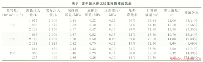 根據(jù)西干線泡排實(shí)驗(yàn)數(shù)據(jù),評(píng)價(jià)泡排前后的壓差和排液效果變化,試驗(yàn)壓降和攜液結(jié)果見(jiàn)表5。從表5可以看出:①隨著泡排劑的注入,輸送壓差總體呈現(xiàn)下降趨勢(shì),如果實(shí)際注入量小于理論注入量,則導(dǎo)致降壓效果不佳;②在相同集氣量下,注入泡排劑量越大,壓降效果越顯著;③在相同的泡排劑注入量下,壓降與集氣量密切相關(guān),在100×104m3集氣量下,壓降為0.22MPa,集氣量為150×104m3時(shí),最大壓降為0.20MPa,在200×104m3集氣量下,最大壓降為0.11MPa,分析認(rèn)為集氣量大,氣流速度快,泡排劑與積液的作用時(shí)間短,進(jìn)一步優(yōu)化注入量與集氣量、注入時(shí)間及注入制度之間的關(guān)系,確保泡排劑與積液的充分作用,以進(jìn)一步提高泡排效果。