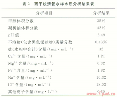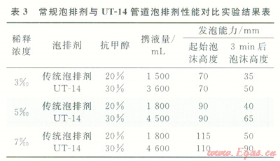 目前國(guó)內(nèi)外所使用的泡沫劑為了減少礦化度、溫度對(duì)其排液效果的影響,基本上采用陰離子表面活性劑[17],由于西干線管線積液(表2)中有大量的甲醇和凝析油,其為擴(kuò)散能力很強(qiáng)的低分子量物質(zhì),它的存在將加快泡排劑泡沫表面的排液速度,使得泡排劑產(chǎn)生的泡沫極不穩(wěn)定,很容易破滅。為此,對(duì)管線泡沫排水劑配方研究從以下兩方面進(jìn)行:①為了消除甲醇對(duì)發(fā)泡劑泡沫穩(wěn)定性的影響,對(duì)活性劑進(jìn)行篩選,選用泡沫壁相對(duì)較厚且泡沫形狀呈菱形穩(wěn)定結(jié)構(gòu)的活性劑作為泡沫排水劑的發(fā)泡成分,并且加入增溶劑,以增大活性劑在配方中的溶解度,使得配方中有效發(fā)泡成分大大增加,以消除抗凍劑對(duì)泡沫排水劑發(fā)泡、帶液能力的影響;②在發(fā)泡劑分子上引入羧基基團(tuán),讓這種網(wǎng)狀基團(tuán)阻礙或減慢甲醇這類擴(kuò)散劑分子侵入發(fā)泡劑泡沫表面,減慢或消除甲醇對(duì)發(fā)泡劑泡沫排液的影響。取西干線清管的水樣,通過(guò)系列室內(nèi)實(shí)驗(yàn),研制出管道高抗醇、抗油的管道泡排劑UT-14,3種活性劑(a:油患子精華素;b:聚乙二醇;c:三乙醇胺)的最佳配制比例為:a:b:c=10:4:1,其發(fā)泡能力(泡沫高度)達(dá)到150mm,5min后也能保持在120mm。參照泡排劑評(píng)價(jià)相關(guān)標(biāo)準(zhǔn),開(kāi)展常規(guī)泡排劑與新研制泡排劑UT-14對(duì)比實(shí)驗(yàn),實(shí)驗(yàn)結(jié)果見(jiàn)表3,由此叮以看出,管道泡排劑UT-14抗醇、抗油能力較好,現(xiàn)場(chǎng)使用濃度(體積分?jǐn)?shù))為3.00‰~5.00‰,該濃度泡排劑加注后不會(huì)對(duì)下游分離沒(méi)備、管線造成影響。