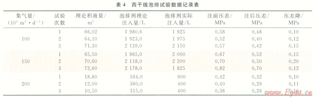 在西干線100×104m3/d、150×104m3/d、200×104m3/d不同氣量下進(jìn)行現(xiàn)場(chǎng)試驗(yàn),在一周期試驗(yàn)結(jié)束壓差下降后,持續(xù)生產(chǎn)一段時(shí)間管線進(jìn)出口壓差回升時(shí),繼續(xù)注入泡排劑,如此反得周期性注入,探索泡排劑作用周期,形成給定氣量下的泡排劑加注制度。試驗(yàn)前,利用上述管道積液量計(jì)算理論計(jì)算西干線給定氣量、壓差下積液量,根據(jù)泡排劑室內(nèi)實(shí)驗(yàn)的加注深度,計(jì)算出的理論注入量,實(shí)驗(yàn)參數(shù)及結(jié)果見(jiàn)表4.