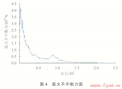 數(shù)值分析采用迭代方法計(jì)算,在迭代過程中監(jiān)控一些變量或參數(shù)的變化,以判斷分析結(jié)果是否正確,模型是否與實(shí)際相符[6-7]。監(jiān)控模型最大不平衡力,所謂體系最大不平衡力,是指每一個(gè)計(jì)算循環(huán)中,外力通過網(wǎng)格節(jié)點(diǎn)傳遞分配到體系各節(jié)點(diǎn)時(shí),所有節(jié)點(diǎn)的外力與內(nèi)力之差中的最大值。如圖4~6監(jiān)控了最大不平衡力,并記錄了位移等值線圖和應(yīng)力等值線圖。