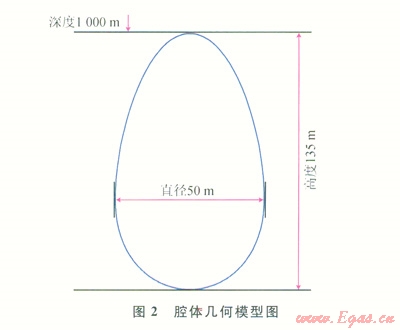 我國鹽巖礦藏以多夾層鹽巖為主,由于主要分析鹽穴儲氣庫溶腔在鹽巖蠕變下的變形規(guī)律,因此在建立儲氣庫溶腔模型時(shí)將復(fù)雜的鹽巖夾層簡化為簡單的單層鹽巖層。借鑒江蘇金壇鹽穴儲氣庫的建庫參數(shù)[4],建立了如圖2所示的腔體幾何模型。建立溶腔及圍巖地層模型后,將地層巖石力學(xué)參數(shù)、鹽層的蠕變關(guān)系、溶腔周圍的地應(yīng)力參數(shù)及溶腔運(yùn)行參數(shù)帶入模型中進(jìn)行模擬計(jì)算。