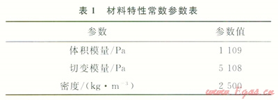 圖3中,1/4圓柱體模擬儲氣庫溶腔周圍的地質(zhì)環(huán)境,其直徑是儲氣庫溶腔模型最大直徑的20倍,在網(wǎng)格中間位置可以看到儲氣庫溶腔輪廓的1/4。在網(wǎng)格劃分時(shí)將儲氣庫溶腔網(wǎng)格一起劃分,有助于儲氣庫溶腔的形成。在此網(wǎng)格中,定義了2個(gè)組,分別是group1和group2,前者對儲氣庫溶腔進(jìn)行網(wǎng)格劃分,后者對儲氣庫溶腔周圍地質(zhì)環(huán)境進(jìn)行網(wǎng)格劃分。選擇采用各向同性彈性模型,其材料特性常數(shù)見表1。