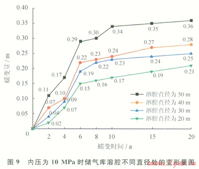 根據(jù)模擬計(jì)算所得結(jié)果,可以得到不同壓力下儲氣庫溶腔不同直徑處變形量圖(圖9~11),經(jīng)總結(jié)分析,僅列出具有代表性的分析圖。圖9~11分別表示溶腔內(nèi)壓為10MPa、20MPa、30MPa時(shí),不同蠕變時(shí)間鹽穴儲氣庫溶腔不同直徑處的變形量。