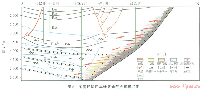 早期生烴作用與油氣充注形成超壓是陸相斷陷盆地油氣成藏的另一種類型,其條件是毗鄰斷陷深洼的陡坡帶、發(fā)育巨厚的近岸水下扇砂礫巖體和短距離的油氣運聚(圖6)。