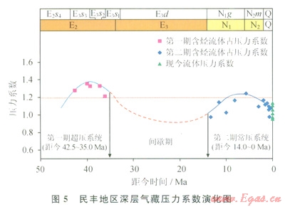 民豐地區(qū)深層氣藏(包括凝析氣藏)古壓力系數(shù)隨時間演化的關系表明(圖5):