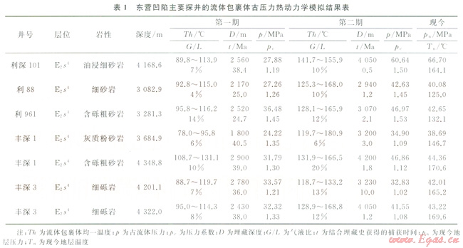 將各期次鹽水包裹體的均一溫度及其共生的同期含烴鹽水包裹體或烴類包裹體的均一溫度、氣/液比和化學組成輸入VTFLINC軟件,即可獲得熱動力學模擬結果——各期次流體包裹體的最小捕獲壓力和壓力系數(shù)。利用東營凹陷北帶利津、民豐等地區(qū)所采集樣品獲得“數(shù)據(jù)對”的樣品開展了熱動力學模擬,模擬得到了主要探井的部分古流體壓力(表1)。