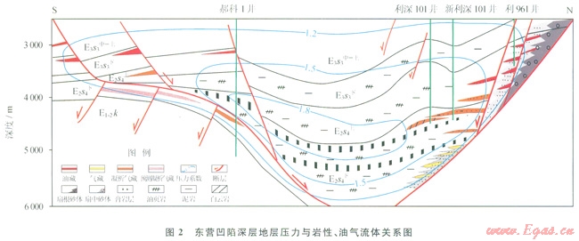東營凹陷是中國東部富油氣凹陷之一,含油氣豐度高,探明儲量大,目前已發(fā)現(xiàn)的油氣主要分布于埋深小于3500m的地層。隨著近期深層勘探的不斷深入,在東營凹陷北部陡坡帶的民豐、利津等地區(qū)發(fā)現(xiàn)了凝析氣藏和氣藏,實現(xiàn)了深層勘探的重大突破,展示了深層較好的油氣勘探前景。但是,油氣藏的地質條件和流體壓力存在較大的差異,在古近紀的構造演化過程中,兩地區(qū)存在沉降中心的轉換,導致沉積作用、生烴作用和油氣富集發(fā)生較大的變化,直接表現(xiàn)出深層凝析氣藏和氣藏的地層壓力既有常壓,也有超壓。