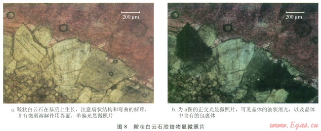 見天壩生物礁白云巖中存在許多鞍狀白云石膠結物,其通常出現(xiàn)在次生孔隙中,以孔隙充填方式出現(xiàn),并和基質白云石共生。這些鞍狀白云石晶體粗,白形程度高(自形一半自形),通常具有解理,有時含有固體包裹體,單偏光下呈溶蝕狀,正交光下具有明顯的波狀消光(圖8)。