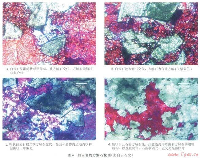 白云巖形成后,在深埋藏條件下,還有微弱的去白云石化作用。從圖4中不難看出,白云石具有港灣形彎曲和被鐵方解石交代殘留的特征。去白云石化或方解石化的交代物為鐵方解石,顯示藍色或淺藍色(混合液鐵氰化鉀+茜素紅—S染色),晶體為細粒狀集合體(圖4)。這與白云石化時交代裂縫方解石顏色(紅色)和結構(粗品質)是不一樣的。白云石的方解石化顯然是在深埋藏條件下與流體成分變化有關,即還原條件下pH值變化(偏酸性),流體富含Fe離子有關。