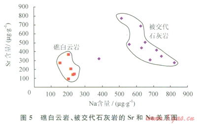 從礁白云巖、石灰?guī)r的Sr和Na關系圖上(圖5)不難看出,白云巖比被交代母質石灰?guī)r具有較偏低的Sr和Na值,這種現(xiàn)象是怎么發(fā)生的呢?