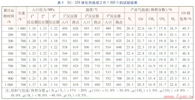 1#反應器入口壓力為1.15~1.25MPa,1#反應器入口溫度為490~560℃,原料氣中CO體積分數為31%~34%的穩(wěn)定運轉條件下,SU-329催化劑原料氣的低熱值比為1.17左右,產品氣的低熱值為 連續(xù)工作1000h的試驗結果見表4。
