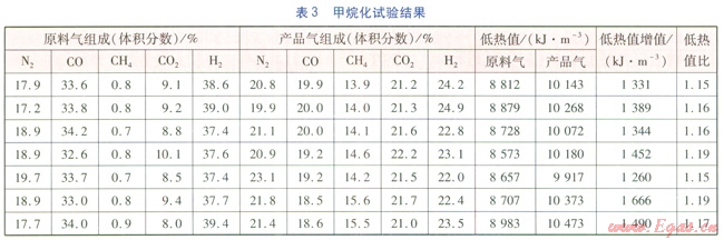 由表3可知,產品氣中CO體積分數小于等于20%,CH4體積分數為13.9%~15.6%,產品氣與10000kJ/m3左右,增值達1400kJ/m3左右。
