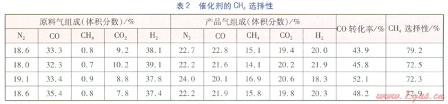 由表l可知,當原料氣中CO濃度基本相同時,在1#反應器入口溫度相同的條件下,隨著1#反應器入口壓力的降低,產品氣中的CH4含量和CO轉化率下降明顯,這說明催化劑活性對壓力變化很敏感。當1#反應器人口壓力幾乎不變時,在1#反應器入口溫度相同的條件下,隨著原料氣中CO濃度的降低,產品氣中的CH4含量和CO轉化率也隨之下降。