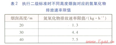 根據(jù)GB 3095—1996《環(huán)境空氣質(zhì)量標準》規(guī)定,該項目所在地為二類區(qū)(城鎮(zhèn)規(guī)劃中確定的居住區(qū)、商業(yè)交通居民混合區(qū)、文化區(qū)、一般工業(yè)區(qū)和農(nóng)村地區(qū)),應執(zhí)行二級標準。根據(jù)GB 16297—1996規(guī)定,執(zhí)行二級標準時不同高度煙囪對應的氮氧化物排放速率限值見表2。
