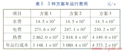 3種方案年運(yùn)行費(fèi)用見(jiàn)表5。水價(jià)按2元/t計(jì)算,電價(jià)按0.3707元/(kW·h)計(jì)算,蒸汽熱價(jià)按18元/GJ計(jì)算。由表3可知,方案1的系統(tǒng)造價(jià)最高,其次為方案2,方案3的系統(tǒng)造價(jià)最低。由表5可知,方案2的年運(yùn)行費(fèi)用最低,其次為方案1,方案3的年運(yùn)行費(fèi)用最高。將方案3作為對(duì)比方案,方案1、2高出的系統(tǒng)造價(jià),分別在2.8、2.4a時(shí)可以收回。考慮年運(yùn)行費(fèi)用,方案1、2的整體經(jīng)濟(jì)性優(yōu)于方案3,且方案1、2的差距不大。