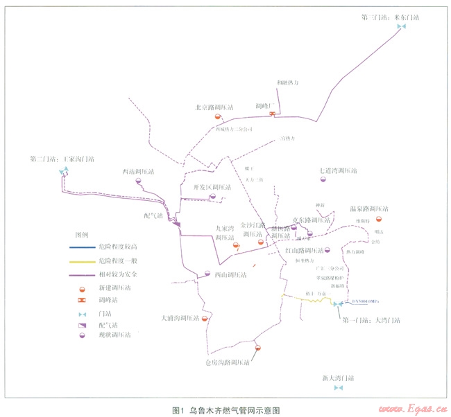 烏魯木齊市天然氣管道自1991年起步,經過近20余年的工程建設,烏魯木齊的天然氣傳輸和分配管道約3908.46km,其中高壓管道的67.94km,次高壓管道191.53km,低壓管道3589km。2013年天然氣用戶累計達到105.5萬戶,燃氣普及率已達99%以上,全年天然氣供應總量為23.13億m3。近年來,隨著烏魯木齊市“煤改氣”工程的推進,大量高壓燃氣管線進入城市中心區(qū),城市燃氣管道長度日益增長,城市燃氣管道系統(tǒng)的安全問題也日益嚴峻,給城市公共安全帶來巨大風險。
