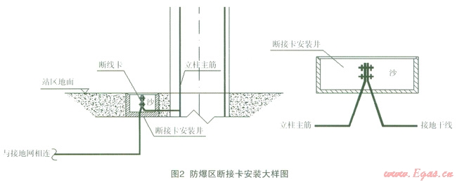 屋面避雷帶及接閃短桿均與建筑物鋼筋混凝土立柱內(nèi)主筋相焊接,鋼筋混凝土立柱內(nèi)(兩根不少于Æ16)主鋼筋做引下線(引下線采用綁扎連接),與接地網(wǎng)作可靠電氣連接。作引下線的立柱應沿建筑物四周均勻布置,間距不得大于18m。很多設計員存距地面0.3m~0.5m的立柱上設斷接卡與站內(nèi)的人工接地網(wǎng)相連接,但壓縮機間、工藝罩棚立柱周圍都處于防爆區(qū),在防爆區(qū)內(nèi)直接設置斷接卡存在很大的安全隱患,所以防爆區(qū)內(nèi)引下線斷接卡應采用防爆接線盒安裝,并用防爆膠泥密封,或者是設置在地面上,用干沙填實。尤其是LNG場站更需注意,因為LNG泄漏后迅速氣化而形成的低溫氣體比重較大,會聚集在地面附近,遇到斷接卡放電時極易發(fā)生爆炸。