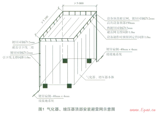 根據(jù)《建筑物防雷設計規(guī)范》GB50057—2010規(guī)定,加氣站、門站、調(diào)壓站內(nèi)的工藝罩棚、壓縮機間等工藝構(gòu)筑物均屬于2類防雷建筑物,站內(nèi)的站房、輔房屬于3類防雷建筑物。在壓縮機間犀面上用中12熱鍍鋅圓鋼敷設不大于10m×10m或12m×8m的避雷網(wǎng)格,四角做接閃短桿。工藝罩棚一般為雙層彩鋼板屋面,中間為阻燃物,很多設計員認為即使罩棚遭受雷擊,只要彩鋼板厚度大于0.5mm,閃電只會擊壞罩棚而不會危及罩棚下的工藝裝置和人員的安全,所以直接利用罩棚作接閃器。但這種思路卻忽略了對罩棚本身的防護,罩棚頂部被擊壞后維修比較困難,并且罩棚被擊壞后雨水滲入會對罩棚的鋼結(jié)構(gòu)造成腐蝕,縮短罩棚的使用壽命。所以在罩棚頂部也應用F12熱鍍鋅圓鋼布置成不大于10m×10m或12m×8m的避雷網(wǎng)格,并在四角做接閃短桿。