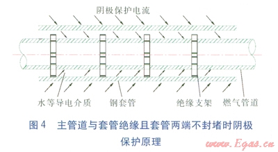③不可避免加設(shè)套管時(shí),套管兩端可不必密封防水材料,只要在主管道與套管之間充填柔軟材料防止沙石進(jìn)入對(duì)防腐層起破壞作用即可。因?yàn)楫?dāng)套管內(nèi)有水或泥土存在時(shí),能起到導(dǎo)電介質(zhì)的作用,陰極保護(hù)電流通過介質(zhì)形成回路,不會(huì)被屏蔽。套管可視為土壤介質(zhì)的一部分,陰極保護(hù)電流從套管外壁流入,從套管內(nèi)壁流出,再?gòu)闹鞴艿劳獠苛魅耄鞴艿缹⑹艿胶芎玫年帢O保護(hù)[2]。如果套管與主管道間有特定性能的電解質(zhì)物質(zhì),導(dǎo)電性能會(huì)更好,主管道陰極保護(hù)的效果會(huì)更好,其原理見圖4。