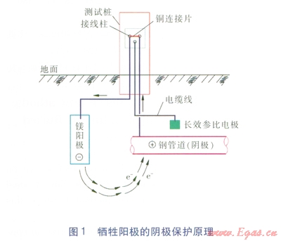 陰極保護(hù)分犧牲陽(yáng)極陰極保護(hù)法和外加電流陰極保護(hù)法。綠博公司主管道采用的是犧牲陽(yáng)極陰極保護(hù)法,其原理就是原電池的原理,是將一種比鐵更活潑的鎂陽(yáng)極與被保護(hù)的鋼管相連接,通過鎂陽(yáng)極的不斷氧化反應(yīng),向被保護(hù)的鋼管提供保護(hù)電子,使其獲得保護(hù)。犧牲陽(yáng)極陰極保護(hù)原理見圖l。