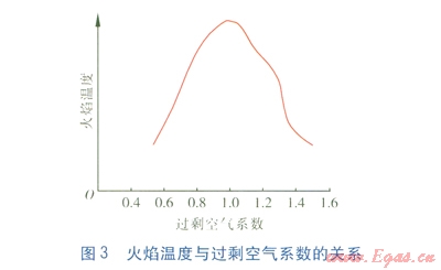 要實(shí)現(xiàn)穩(wěn)定的全預(yù)混燃燒,關(guān)鍵在于保持合理、穩(wěn)定的空燃比。實(shí)驗(yàn)證明,全預(yù)混燃燒空燃比過(guò)大或者過(guò)小都會(huì)對(duì)燃燒造成不利影響。空燃比過(guò)大時(shí),多余空氣會(huì)帶走熱量,火焰溫度降低,熱效率降低;空燃比過(guò)小時(shí),燃燒不充分,火焰溫度及熱效率亦降低。同理,當(dāng)空燃比過(guò)大時(shí),多余的空氣會(huì)稀釋離子;過(guò)小時(shí),由于未能充分反應(yīng),燃燒過(guò)程未能產(chǎn)生足夠多的離子?;鹧鏈囟扰c過(guò)剩空氣系數(shù)的關(guān)系見(jiàn)圖3。由圖3可知,當(dāng)空燃比最佳時(shí),火焰溫度達(dá)到峰值,火焰離子電流也達(dá)到峰值。這是離子電流檢測(cè)法用于判斷全預(yù)混燃燒空燃比的理論依據(jù)。