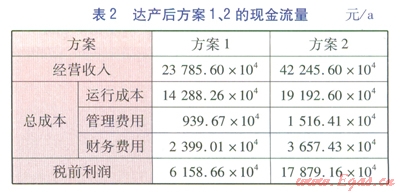 本文采用內(nèi)部收益率(稅前)、凈現(xiàn)值(稅前)、動態(tài)投資回收期(稅前)作為方案經(jīng)濟(jì)性評價指標(biāo)。內(nèi)部收益率的經(jīng)濟(jì)含義是項目在其壽命期內(nèi)未回收資金的預(yù)計收益率,項目投入運營后,投資額將通過每年所產(chǎn)生凈效益的形式逐步得到回收。已回收部分將用于再投資,未回收部分待繼續(xù)回收,內(nèi)部收益率就是指未回收部分的收益率,因此稱為內(nèi)部收益率。凈現(xiàn)值的經(jīng)濟(jì)含義是項目在其壽命期內(nèi)預(yù)計創(chuàng)造的全部凈效益。內(nèi)部收益率、凈現(xiàn)值都是反映項目贏利能力的指標(biāo),前者體現(xiàn)的是相對贏利能力,后者體現(xiàn)的是絕對贏利能力。內(nèi)部收益率、凈現(xiàn)值越大,項目贏利能力越強。動態(tài)回收期越短,說明項目收回投資額的時間越短。方案1、2的經(jīng)濟(jì)性評價指標(biāo)見表3。由表3可知,方案2的內(nèi)部收益率、凈現(xiàn)值均高于方案l,且方案2的動態(tài)投資回收期短于方案l,這說明方案2的經(jīng)濟(jì)性優(yōu)于方案l。