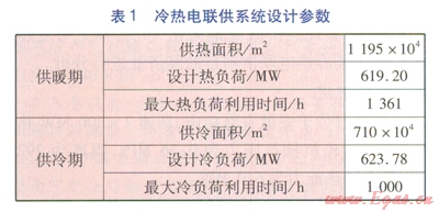 對于供冷對象,考慮到居住建筑同時利用率低、運行管理及收費復(fù)雜等情況,該冷熱電聯(lián)供系統(tǒng)的供冷對象主要考慮辦公、商場等公共建筑,不考慮居住建筑。供熱對象涉及居住建筑及公共建筑,居住建筑供熱面積為627×104m2,公共建筑供熱面積為568×104m2。冷熱電聯(lián)供系統(tǒng)設(shè)計參數(shù)見表l。由表1可知,該冷熱電聯(lián)供系統(tǒng)設(shè)計冷熱負(fù)荷比較接近,這對于熱電機(jī)組的高效運行十分有利。