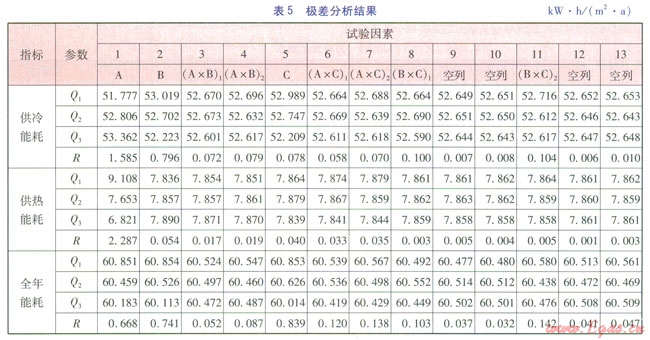 極差法可以簡單、快捷地確定各因素對指標影響的主次順序,方差分析法利用F檢驗可以考察正交試驗因素對指標的影響是否顯著。因此,本文結合極差法和方差分析法對試驗結果進行分析,得到種植屋面能耗影響因素的主次順序,并差別各個因素的顯著性,通過直觀分析綜合比較,確定最優(yōu)試驗方案。