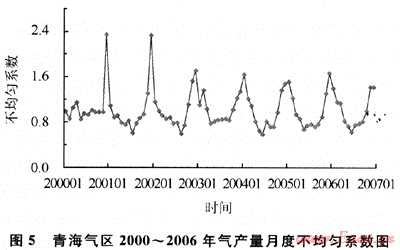 近幾年由于受國家經濟宏觀調控政策和城市環(huán)保要求提高等因素的影響,民用、發(fā)電等用氣增長較快,但民用和采暖用氣的季節(jié)性不均勻問題突出,冬季高月和夏季低月值相差很大。中國石油每年的1、2、3、10、11、12等6個月的不均勻系數(shù)偏大(不均勻系數(shù)為月產量與年均月產量的比值),最高為12月份,連續(xù)6a的12月不均勻系數(shù)都在1.2以上,2005年不均勻系數(shù)達到了1.54的高峰,峰谷差為1.3~1.5倍(圖3)[4~5]。