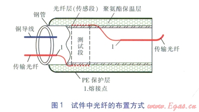 試件為一段長度為200mm的鋼管(材質(zhì)為Q235),對銹蝕測試段外壁進行拋光處理,拋光后測試段外直徑為73.8mm,壁厚為3.5m。試件中光纖的布置方式見圖l。在距鋼管端面50mm處纏繞光纖層(傳感段),纏繞時使光纖帶有一定的預(yù)應(yīng)力,保證光纖與鋼管表面緊密接觸,纏繞的光纖總長度在4m左右。將光纖用環(huán)氧樹脂膠固定在鋼管上,傳感段的引出端與帶保護套的傳輸光纜熔接,將熔接處進行保護處理,并在鋼管兩端的引出位置用環(huán)氧樹脂膠進行固定。光纖設(shè)置完畢后,在鋼管與PE保護管間進行發(fā)泡處理。