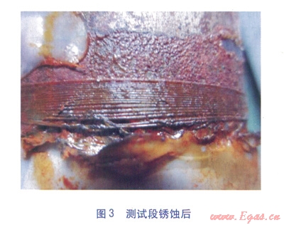 在電化學(xué)加速銹蝕的情況下,試件經(jīng)過2d持續(xù)腐蝕后,布里淵分析儀基本監(jiān)測不到應(yīng)變的變化,此時停止試驗。測試段銹蝕前后的情況分別見圖2、3。