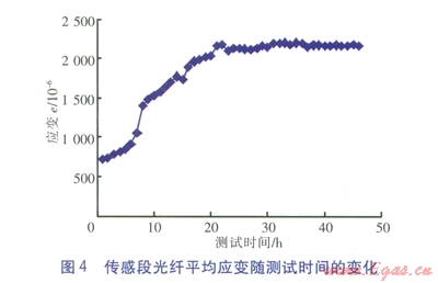 將5個連續(xù)有效測點的光纖平均應(yīng)變作為傳感段光纖平均應(yīng)變,傳感段光纖平均應(yīng)變隨測試時間的變化見圖4。