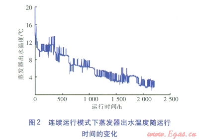 連續(xù)運(yùn)行模式下蒸發(fā)器出水溫度隨運(yùn)行時(shí)間的變化見(jiàn)圖2。由圖2可知,在整個(gè)供暖期內(nèi),蒸發(fā)器出水溫度持續(xù)下降。熱泵機(jī)組的制熱量根據(jù)末端負(fù)荷動(dòng)態(tài)調(diào)節(jié),蒸發(fā)器出水溫度相應(yīng)出現(xiàn)波動(dòng)。連續(xù)運(yùn)行模式下,蒸發(fā)器出水溫度低于5℃的時(shí)間約720h,約占整個(gè)供暖期的32.6%,最低為1.54℃。因此,當(dāng)采用連續(xù)運(yùn)行模式時(shí),易觸發(fā)熱泵機(jī)組的保護(hù)性停機(jī),導(dǎo)致熱泵空調(diào)系統(tǒng)無(wú)法運(yùn)行。