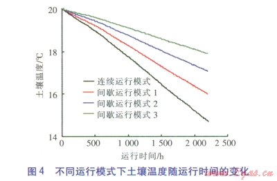 不同運(yùn)行模式下土壤溫度隨運(yùn)行時(shí)間的變化見(jiàn)圖4。由圖4可知,熱泵機(jī)組運(yùn)行時(shí)土壤溫度逐漸下降,下降幅度與地埋管換熱器的運(yùn)行模式有關(guān)。連續(xù)運(yùn)行模式下,到供暖末期,土壤溫度由初期的20℃降為14.72℃,降幅達(dá)5.28℃。間歇運(yùn)行模式1下,到供暖末期,土壤溫度為16.01℃,降幅為3.99℃。間歇運(yùn)行模式2下,到供暖末期,土壤溫度為l7.08℃,降幅為2.92℃。間歇運(yùn)行模式3下,到供暖末期,土壤溫度為17.91℃,降幅為2.09℃。由以上分析可知,當(dāng)日開(kāi)停比減小時(shí),地埋管換熱器運(yùn)行時(shí)間減少,從土壤提取的熱量減少,土壤溫度下降幅度減小。但由于每天的恢復(fù)時(shí)間較短,不足以使土壤溫度有明顯的改變。