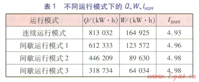 不同運(yùn)行模式下的Q、W、IHSPF見(jiàn)表l。由表1可知,間歇運(yùn)行模式下的IHSPF高于連續(xù)運(yùn)行模式,間歇運(yùn)行模式1~3的IHSPF接近。