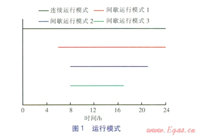對(duì)于地埋管換熱器間歇運(yùn)行模式,將每日的運(yùn)行時(shí)間與非運(yùn)行時(shí)間之比定義為日開(kāi)停比。為了比較連續(xù)運(yùn)行與間歇運(yùn)行模式以及不同日開(kāi)停比的間歇運(yùn)行模式下熱泵機(jī)組的性能,選取連續(xù)運(yùn)行模式和3種間歇運(yùn)行模式進(jìn)行對(duì)比分析,各運(yùn)行模式見(jiàn)圖1。間歇運(yùn)行模式1的日開(kāi)停比為l8:6,間歇運(yùn)行模式2為13:11,間歇運(yùn)行模式3為9-15。模型不考慮地埋管換熱器間歇運(yùn)行對(duì)空調(diào)房間供暖的影響,認(rèn)為地埋管換熱器停用時(shí)段由太陽(yáng)能熱水系統(tǒng)或其他低溫?zé)嵩刺娲寥涝础?span lang="EN-US">
