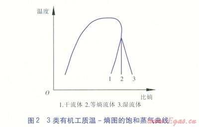 有機(jī)工質(zhì)對(duì)有機(jī)朗循環(huán)發(fā)電系統(tǒng)的性能影響較大。有機(jī)工質(zhì)可根據(jù)溫-熵圖飽和節(jié)氣曲線的右半部分的斜率分3類(見圖2):第一類:斜率為負(fù)的濕流體,這些流體的等熵膨脹易產(chǎn)生凝結(jié)現(xiàn)象,在透平內(nèi)膨脹做功后凝結(jié),易對(duì)透平造成危害。第二類:斜率為正的干流體。第三類:近似垂直的等熵流體。干流體與等熵流體可避免濕流體造成的危害,另外還應(yīng)要考慮有機(jī)工質(zhì)的熱力學(xué)性能和環(huán)保特性。