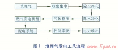 填埋場填埋氣發(fā)電原理是將固體廢棄物填埋場產(chǎn)生的填埋氣通過收集系統(tǒng)集中,再通過預處理裝置凈化(除塵、除水等)、穩(wěn)壓后送入燃氣發(fā)電機組,發(fā)電后通過配電系統(tǒng)、控制系統(tǒng),將發(fā)出的電能輸送到電網(wǎng)(填埋氣發(fā)電工藝流程見圖1)。