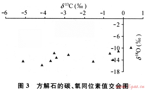 無(wú)論是不穩(wěn)定組分的溶解和交代作用還是碳酸鹽膠結(jié)作用,都與酸性水有關(guān),同時(shí)還需要孔隙水的不斷滲流和交替,否則溶解和膠結(jié)作用將很快達(dá)到相對(duì)平衡狀態(tài)而停止。儲(chǔ)層砂巖中鈣質(zhì)膠結(jié)物δ18O值為-9.8‰~-15.97‰,平均為-13.09‰;δ13C值為-5.11‰~0.41‰,平均為-2.29‰。碳酸鹽膠結(jié)物的碳、氧同位素總體上表現(xiàn)為正相關(guān)性(圖3),折算溫度為105~135℃[4]。根據(jù)碳同位素特征表明,該區(qū)碳同位素值偏負(fù),與有機(jī)質(zhì)排烴時(shí)生成的有機(jī)酸有關(guān)[5~6],其反應(yīng)方程為: