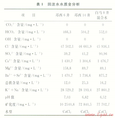 白馬8井是四川盆地邛西氣田回注系統(tǒng)中重要的回注井之一,該回注井接收來自邛西氣田邛西6井、邛西14井、大4井等6口氣井采出的氣田水混合注入地層,日回注量超過450m3。在該氣田水回注系統(tǒng)中,管線結(jié)垢導(dǎo)致通徑變小、水流阻力增大,注水壓力升高,不僅嚴(yán)重影響了回注效率且注水泵高負(fù)荷運(yùn)轉(zhuǎn)存在較大的安全隱患。為解決氣田水回注系統(tǒng)管線結(jié)垢給邛西氣田氣井正常生產(chǎn)帶來的影響,對(duì)邛西氣田白馬8井回注站回注系統(tǒng)水質(zhì)及垢樣進(jìn)行了調(diào)查、分析,找出了造成管線結(jié)垢主要原因并進(jìn)行了阻垢劑篩選及現(xiàn)場試驗(yàn)。