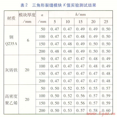 流量修正系數(shù)K的取值,主要取決于裂縫斷面形狀、管材。在實(shí)驗(yàn)室需制作相關(guān)模型分類測(cè)試計(jì)算。建立不同裂縫形狀及大小、不同板材及厚度的模塊,通過對(duì)各種模塊的測(cè)試分析計(jì)算,得出流量修正系數(shù)K的取值范圍。