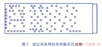 我們采取的優(yōu)化方案是在穩(wěn)壓室內(nèi)增設(shè)一個擋板,并對布風(fēng)板的開孔進(jìn)行重新布置。改造后的穩(wěn)壓室結(jié)構(gòu)及布風(fēng)板開孔位置分別見圖6、7。改造后,通過調(diào)節(jié)擋板位置可以獲得合理的一二次空氣量比例,保證一次空氣量能夠穩(wěn)定且不受燃燒過程的影響。二次風(fēng)由于處于一個楔形通道內(nèi),使得流動更容易均勻,消除穩(wěn)壓室內(nèi)的渦旋氣流的產(chǎn)生。改造后燃燒器內(nèi)部空氣速度場見圖8。