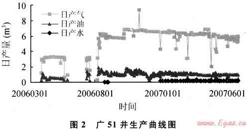 須六段氣藏A區(qū)構(gòu)造頂部的廣51(生產(chǎn)曲線圖見圖2)、廣19、廣安002-23、廣安002-H8、廣安002-21、廣安002-X22、廣安002-Z2、廣安002-25、廣安002-X27和廣安2井等21口井,以及Ⅱ號須四段氣藏廣安106和廣安114井,試采期間幾乎不產(chǎn)水,水氣比穩(wěn)定在0.03m3/104m3左右。