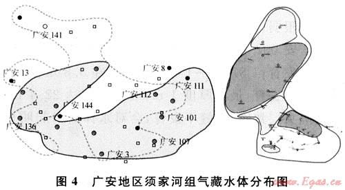 廣安地區(qū)須六段氣藏測試產(chǎn)水井點分布在探明含氣面積內(nèi)東南的廣安002-40-002-43地區(qū)和中部廣安101、107-廣安002-4、109地區(qū),多分布在構(gòu)造相對較低部位。氣藏內(nèi)遵循下水上氣的氣水分異規(guī)律,氣水分異不徹底,氣水過渡帶寬。廣安地區(qū)須四段氣藏在儲量計算范圍內(nèi)目前尚未見到存在邊、底水的跡象,但個別井在測試過程中確實有地層水產(chǎn)出,如廣安113井須四段儲層較發(fā)育,測井解釋儲層厚度達27.3m,平均孔隙度達到10.86%。但由于儲層下部含水飽和度較高,有效儲層厚度為7.38m,平均有效孔隙度為12.26%。該井完鉆后對須四段加砂壓裂測試,獲氣4.3517×104m3/a,水120m3/d;而位于較廣安113井海拔更高的廣安106井測試獲純氣7.1463×104m3/a,自2007年4月生產(chǎn)以來未產(chǎn)水。因此,分析認為,須四段氣藏成藏過程中,在局部范圍內(nèi)相對低凹部位儲層內(nèi),未驅(qū)替殆盡的孔隙水造成孔隙含水飽和度偏高,由于加砂壓裂后人工裂縫網(wǎng)絡(luò)連通了有效儲層,在局部范圍內(nèi)被致密砂體所隔離的夾層水導(dǎo)致廣安113、廣安5等井產(chǎn)出地層水,其水體規(guī)模和水體能量均極為有限。