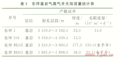 東坪1井區(qū)基巖層試采井有3口,實際單井日產(chǎn)氣12×104~18×104m3,壓降速率為0.026~0.038MPa/d。平均單井日產(chǎn)氣7.8×104~19.8×104m3,壓降速率0.016~0.029MPa/d。該井區(qū)基巖層試采產(chǎn)量較高,壓力高,也說明基巖儲層物性好。