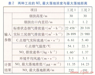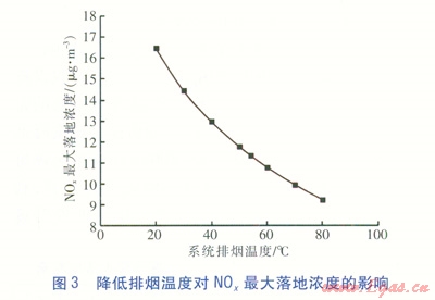 綜合分析正負(fù)兩方面因素,排煙溫度降低對NOx最大落地濃度的影響要比燃料的節(jié)省對NOx最大落地濃度的影響更為顯著,說明排煙溫度降低是主要影響因素,綜合起來NOx最大落地濃度是隨著煙氣溫度的降低逐漸增大的。